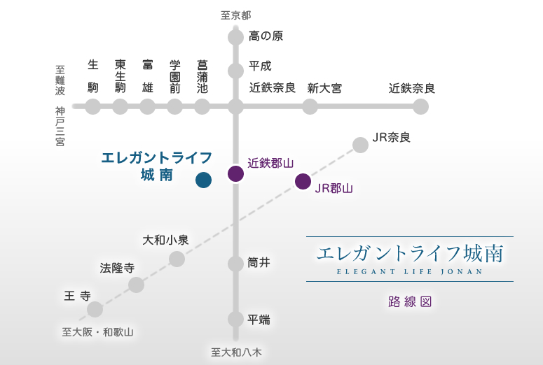 近鉄・JRどちらとも利用でき、奈良県内はもちろん大阪・京都へも1時間以内でアクセスできます。